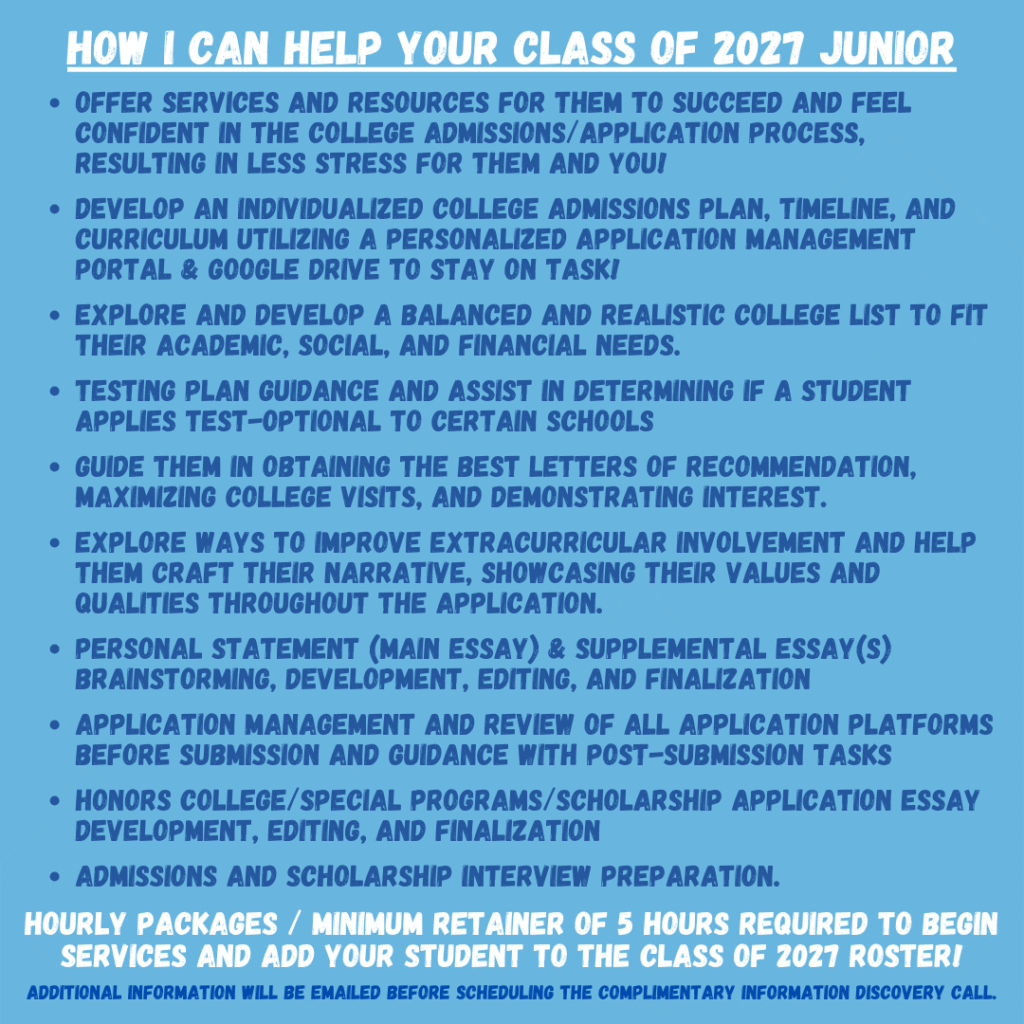 Rebecca begins working with juniors in the fall or spring of their junior year and sometimes the summer before senior year (based on space availability). This maximizes the time needed to complete all their tasks, resulting in less stress during the process! She also offers a Class of 2028 & Class of 2029 Strategy Session Package!